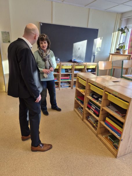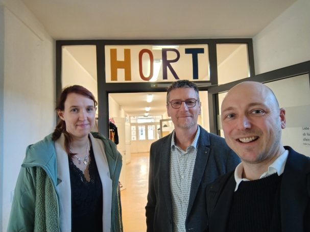 Beim Austausch mit Vorstand René Rixrath, Kitaleitung sowie Erzieherinnen und Hortmitarbeiterinnen wurden Themen wie Betreuungsschlüssel, Ursachen tendenziell zunehmender Verhaltensauffälligkeiten bei Kindern und der Erhalt von Kita- und Schulstandorten auch bei sinkenden Geburtenzahlen diskutiert.